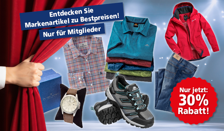Registrieren Sie sich jetzt als Mitglied und profitieren Sie von Ihrem exklusiven Zugang zu Top-Marken-Artikeln zu Bestpreisen und 30% Rabatt auf Ihren Einkauf.